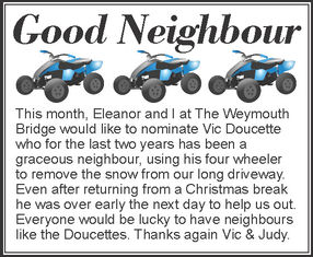 Did you see someone picking up litter, or clearing a driveway, unasked? Please nominate a good neighbour to be recognized. Even a small gesture needs a big Thank You. Just send us the details, and we will consider thanking them publically on The Weymouth Bridge.